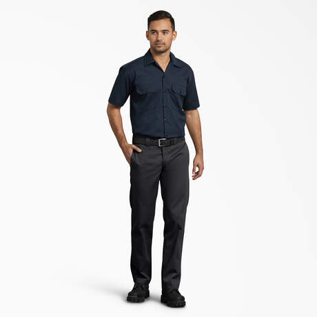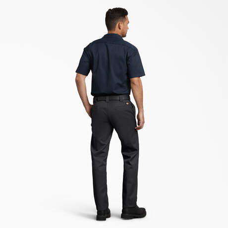 Get comfortable and stay productive even with the toughest of jobs in our Men's 873 Slim Fit Work Pants. No wonder these are our most popular slim work pants. The material is made of a durable polyester/cotton twill blend that is long-lasting and wrinkle-resistant. Dickies 873 Slim Fit Work Pants have a stain-release finish that prevents stains from permanently setting in. The pants also have a slim fit through the seat and thigh, and a straight leg, letting you move around more easily in them. A 2-piece waistband and signature tunnel belt loops support heavy work belts.