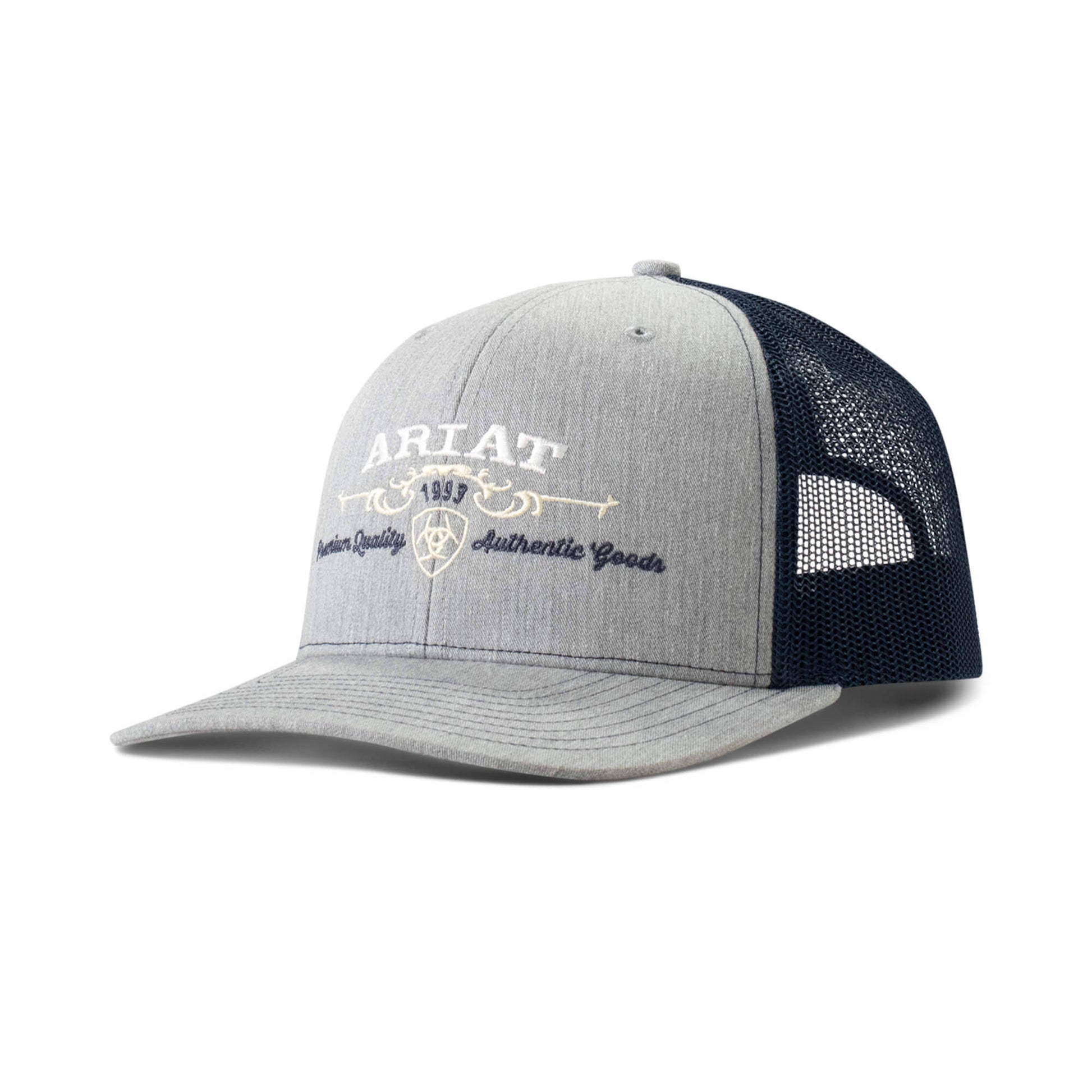 Ariat men’s cap by M&F Western Products. Structured with denim front panels and bill with navy mesh back. Embroidered Ariat 1993 Premium Quality Authentic Goods along with on front panel. Snap back closure for that perfect fit.