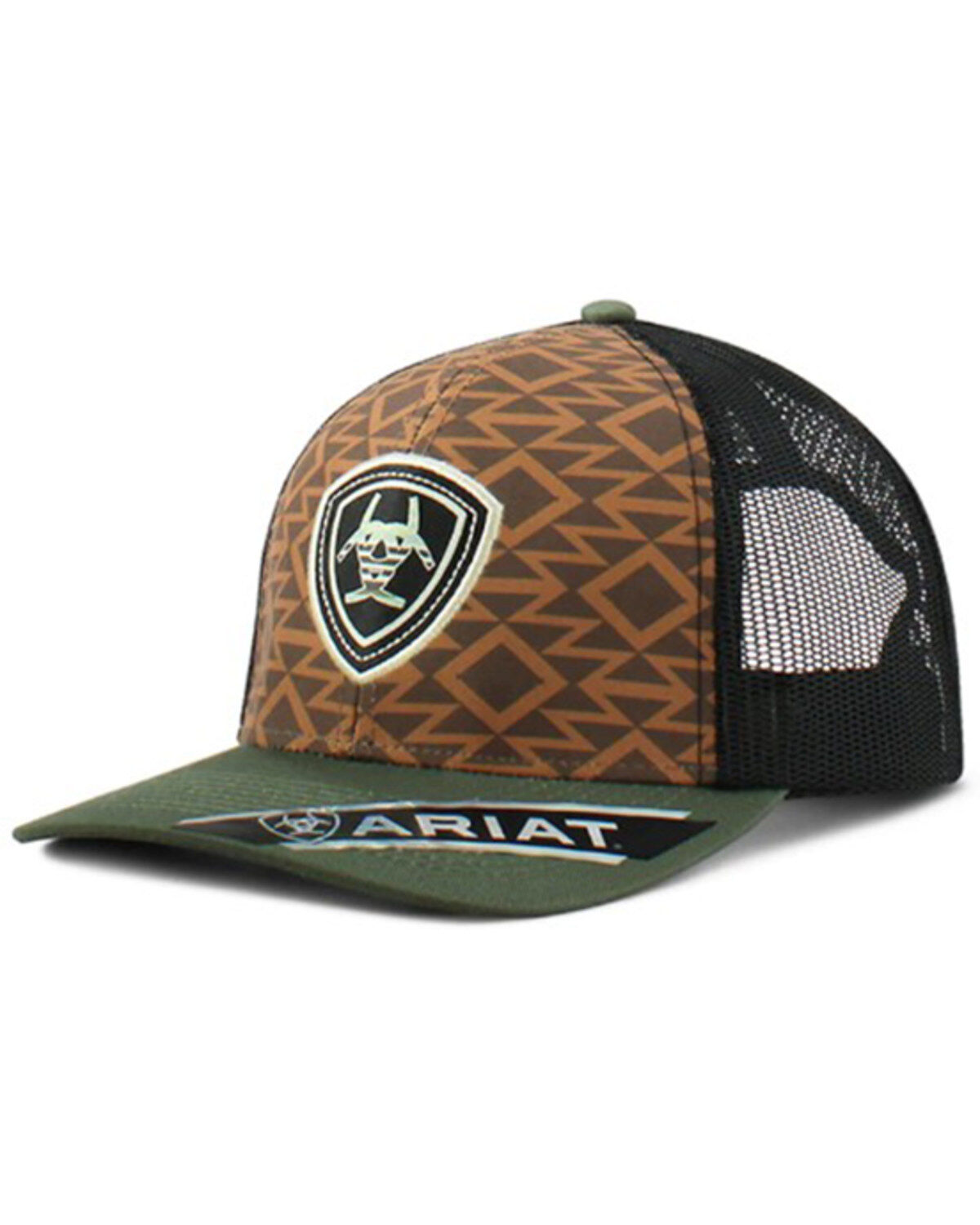 Diseño de estampado suroeste: La gorra luce un hermoso estampado suroeste en marrón que se complementa con una visera verde oliva, lo que la convierte en un accesorio destacado. Su parche con el logotipo de Ariat en rayas de serape añade un toque de autenticidad y estilo.