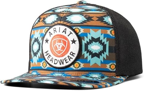 Ariat mens cap by M&F Western Products. Southwest patterned fabric in blues, browns and white on the front of the cap. There is an Ariat patch with white embroidered background and black embroidered Ariat Headwear wording, along with an Ariat logo in the center. Black mesh back and snap back closure for that perfect fit.