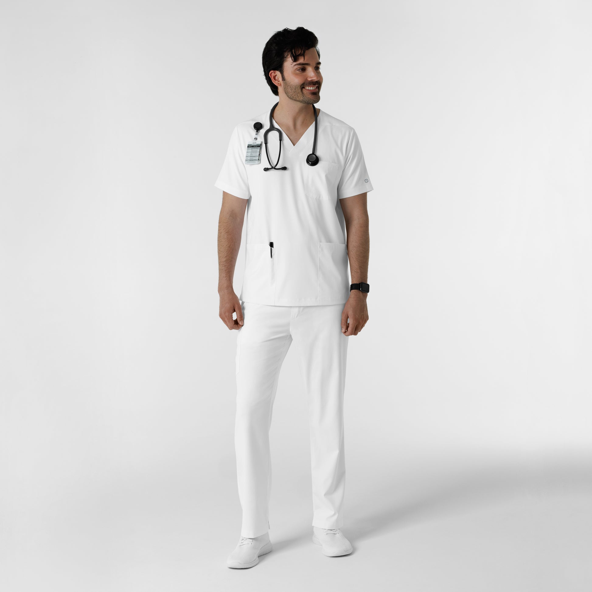 Classic style meets modern utility in this men's scrub top. It brings together the best in comfort, style and practicality to deliver the versatility you need to stay on top of your game. The soft and stretchy material keeps your movement feeling free, whether you're taking care of patients at the front desk or making final rounds. Two top-loading pockets keep the tools you need by your side, including a separate slot dedicated to your pen. One back card pocket with a zipper closure takes care of small essentials you like to keep close. Side hem vents open up the silhouette so your scrub top won't bunch up or constrict as you complete what's next on your to-do list. The timeless V-neck construction creates a polished, professional presentation, while the hem drapes slightly longer in the back for a modern fit and fresh style. Built for function, this scrub top aces everyday purpose.