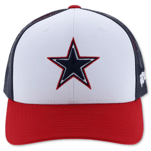 - Blanca con malla azul marino y visera roja, logotipo de estrella roja/blanca/azul.