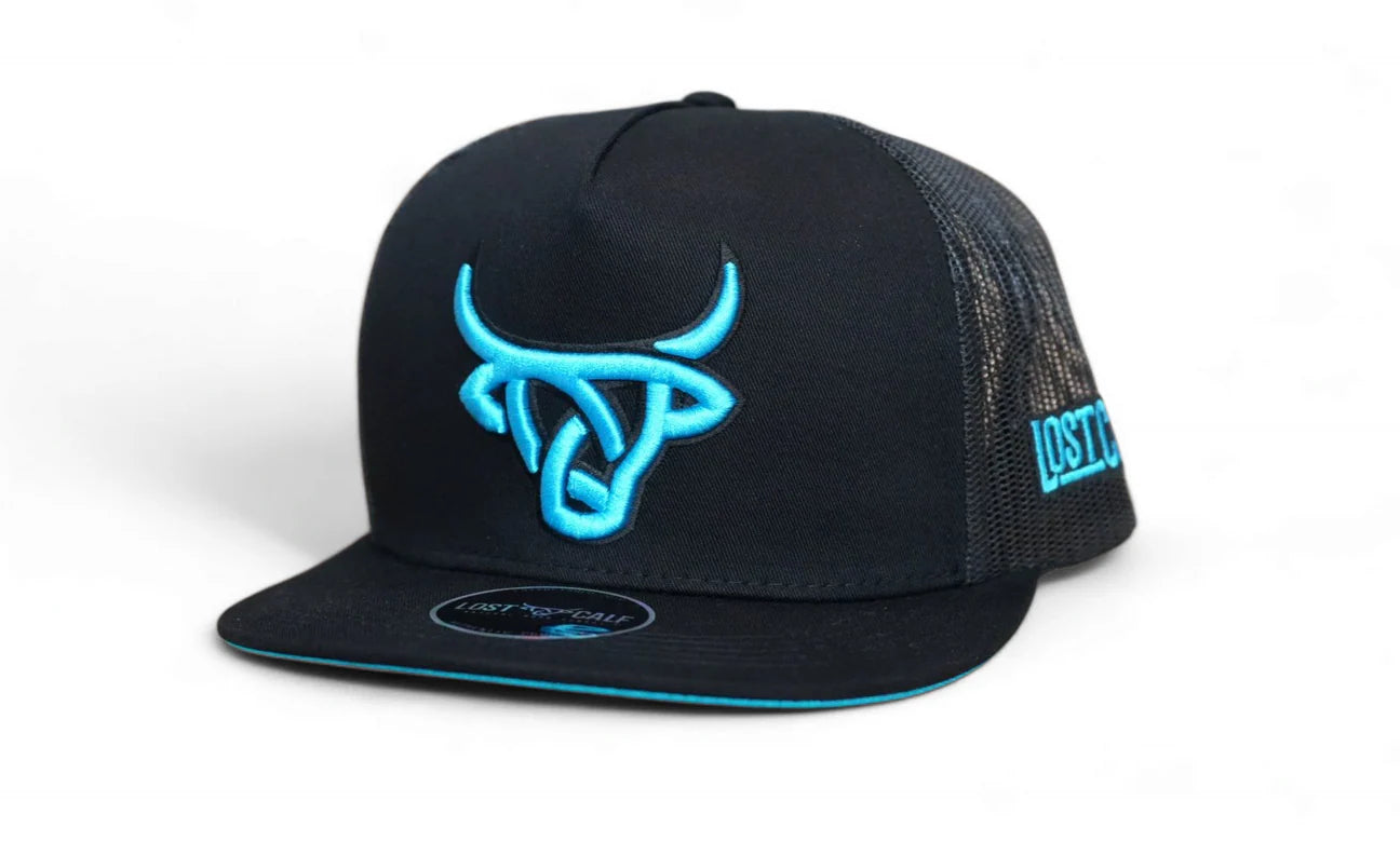 Baseball cap with Lost Calf logo embroidered on front in Black , Lost Calf stitched on left side. Snap back - one size fits all.