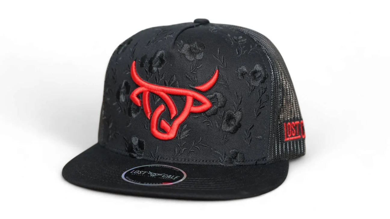 Baseball cap with Lost Calf logo embroidered on front in Black , Lost Calf stitched on left side. Snap back - one size fits all.
