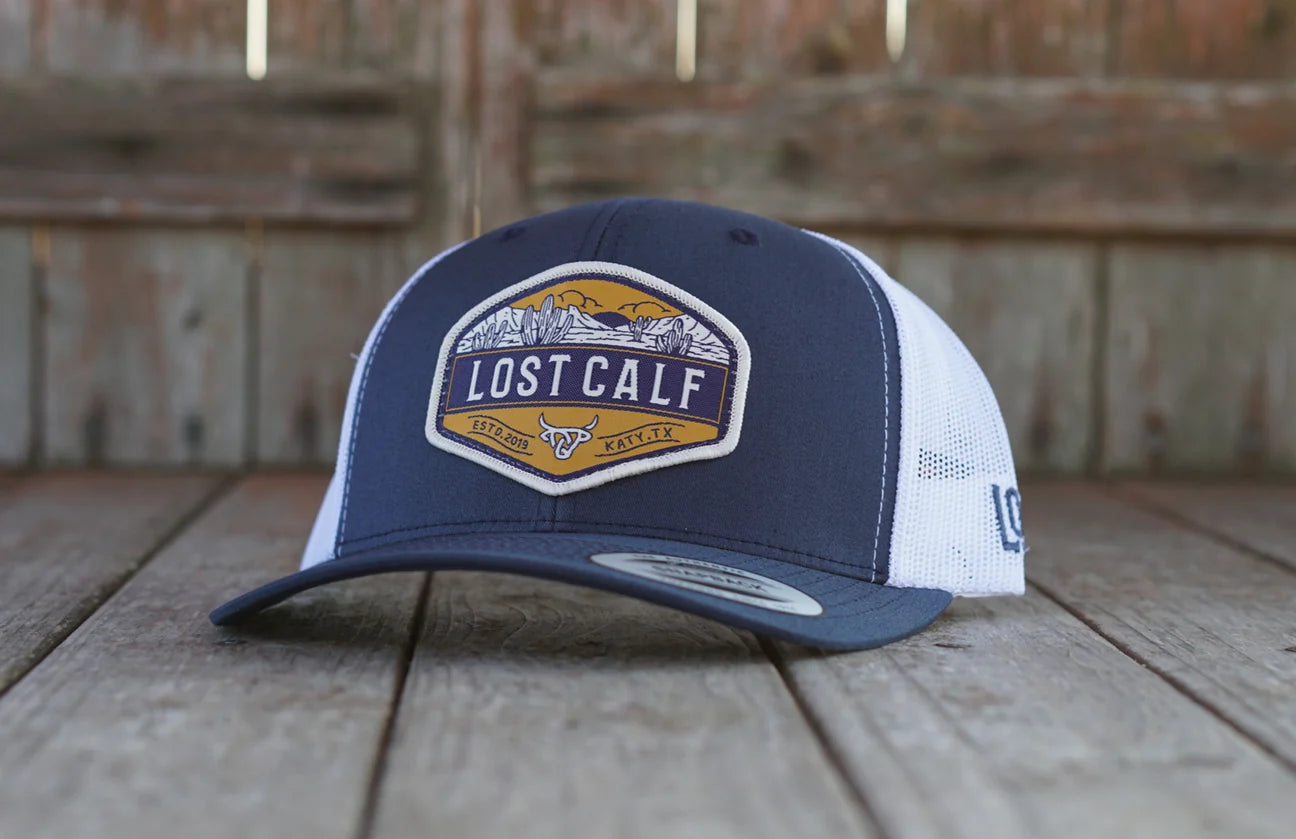 Two tone baseball cap with Lost Calf patch on front, Lost Calf stitched on left side. Snap back - one size fits all.