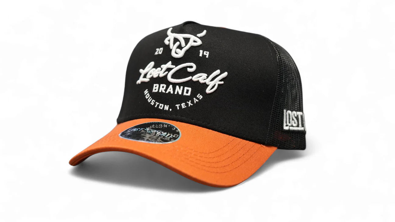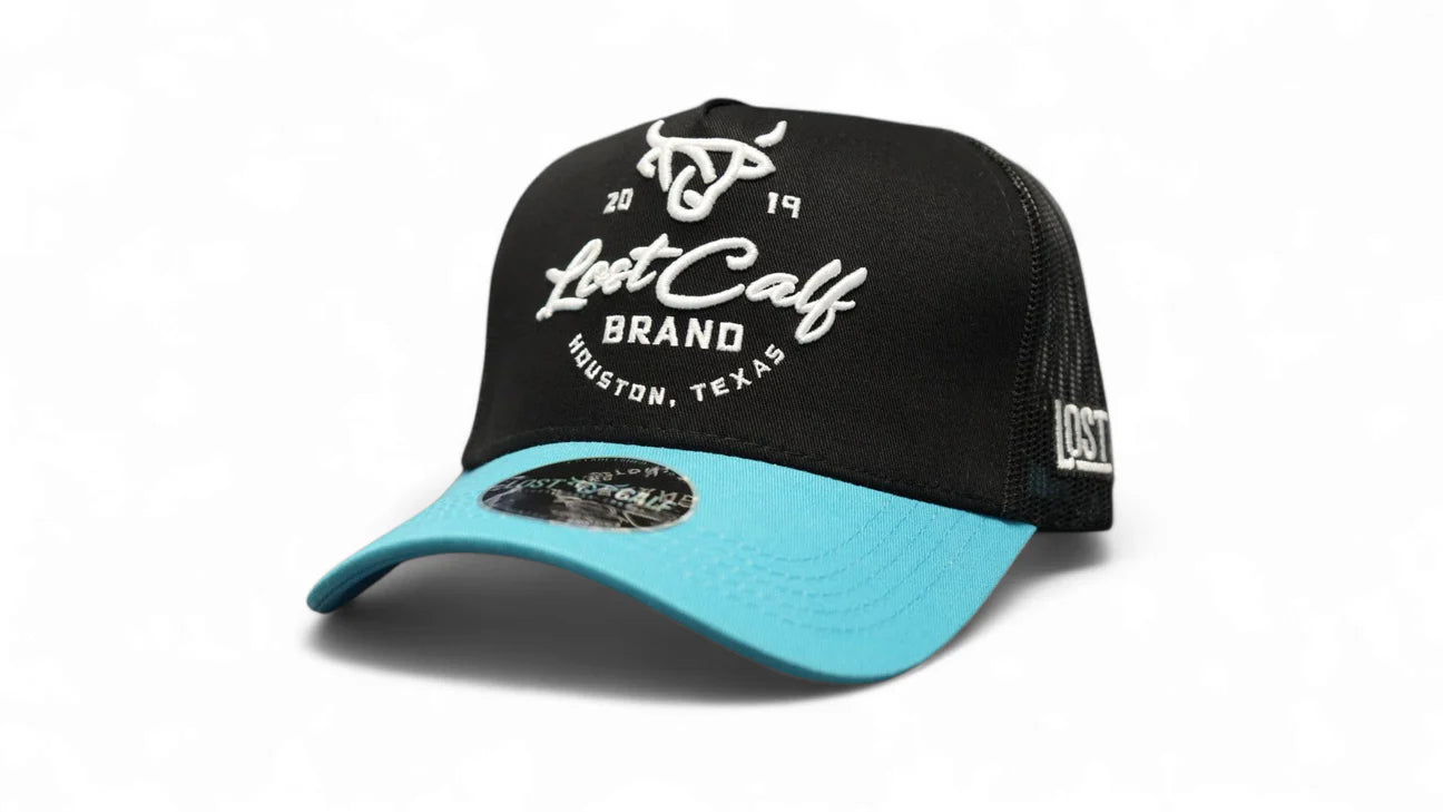 Baseball cap with Lost Calf logo embroidered on front, Lost Calf stitched on left side. Snap back - one size fits all.