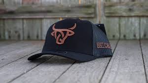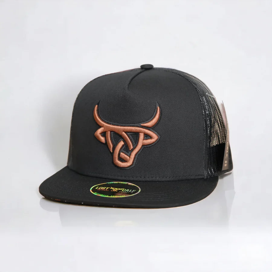 Trucker cap with Lost Calf logo embroidered on front in brown with , Lost Calf stitched on left side. Snap back - one size fits all.