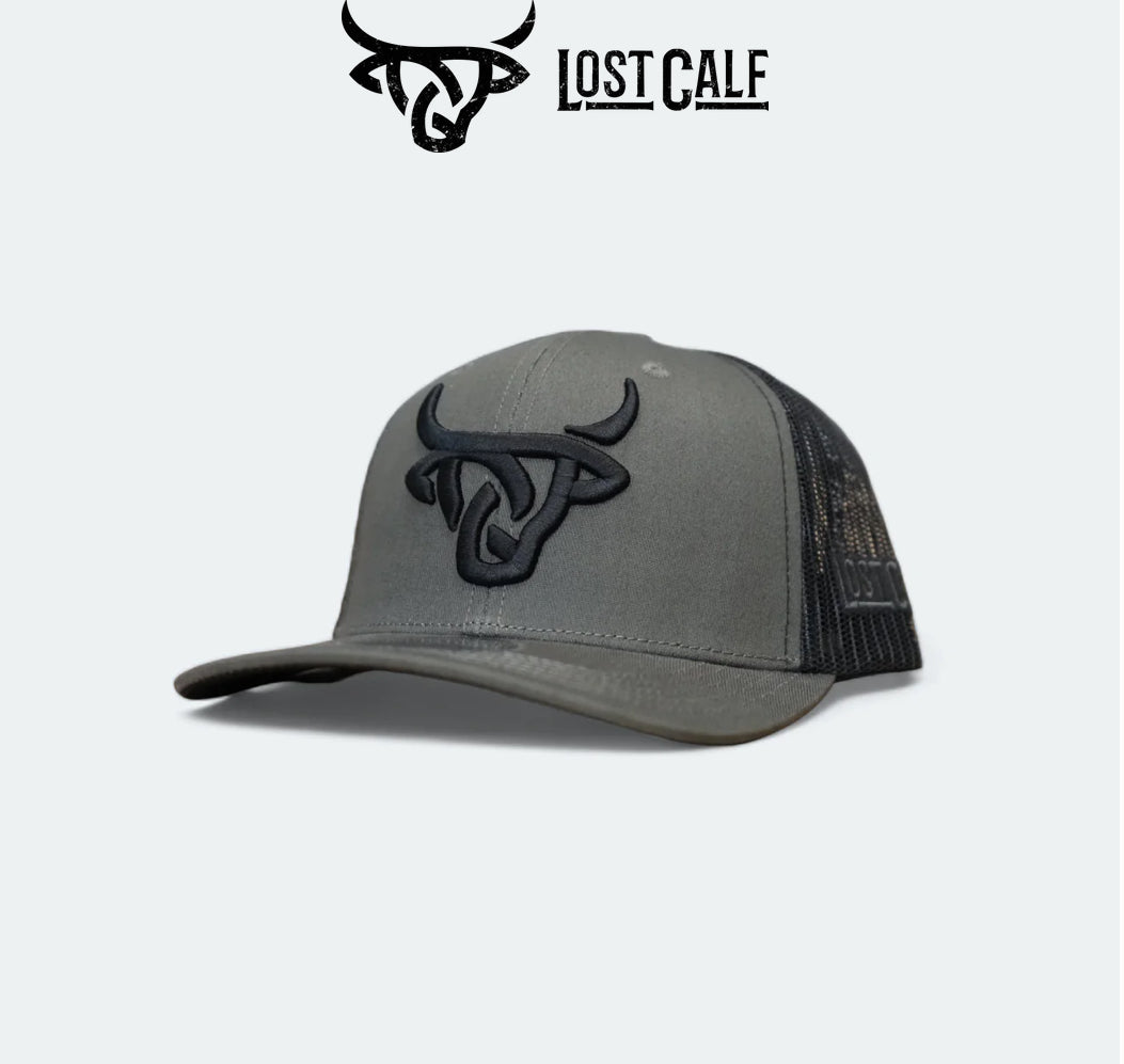 Two tone baseball cap with Lost Calf logo embroidered on front, Lost Calf stitched on left side. Snap backspace - one size fits all.