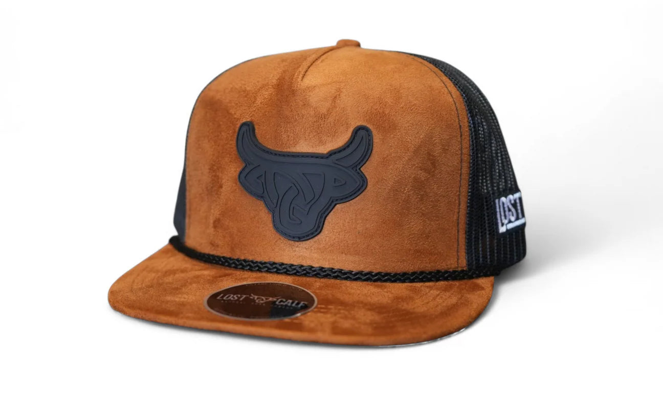 Baseball cap with Lost Calf logo embroidered on front in Black , Lost Calf stitched on left side. Snap back - one size fits all.