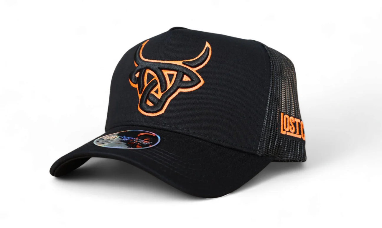 Baseball cap with Lost Calf logo embroidered on front, Lost Calf stitched on left side. Snap back - one size fits all.