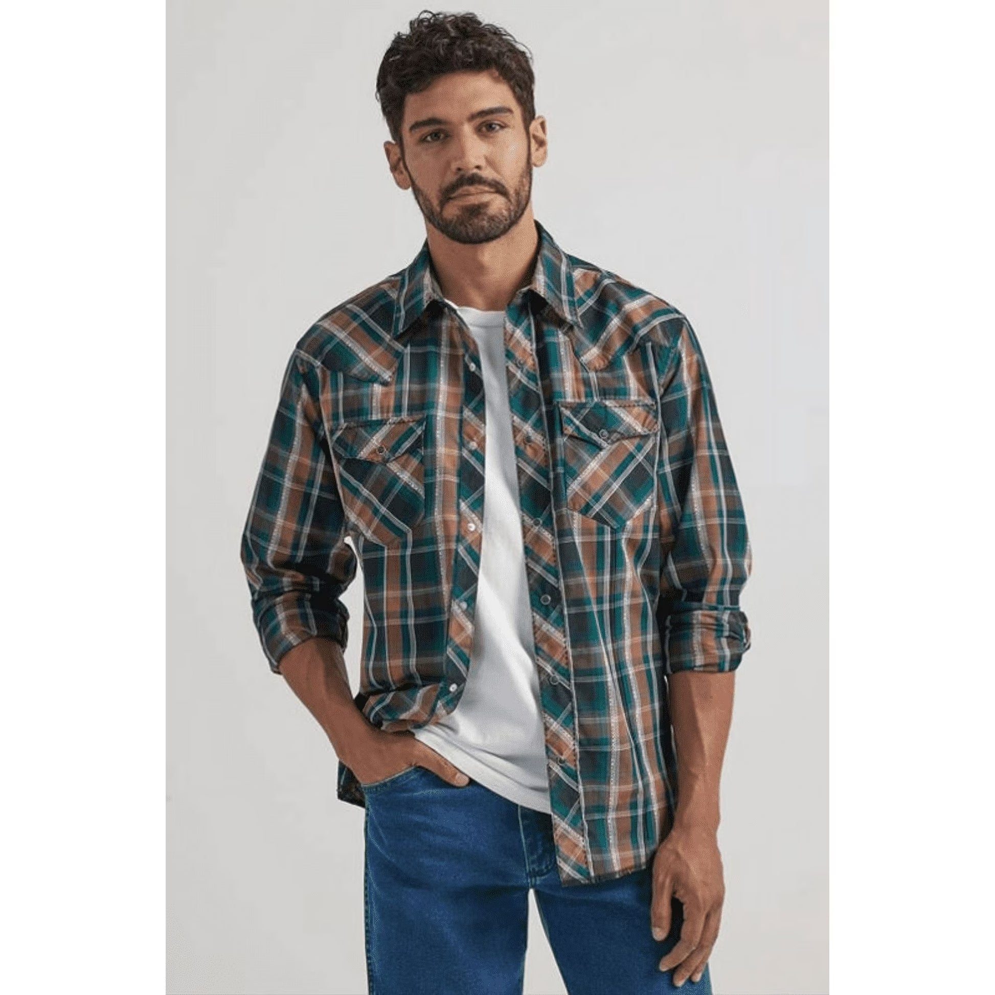 Spread Collar Authentic Western Yokes Flap Pockets with Snap Closure Moves with you Two Snap Cuffs Easy Care 55% Cotton/25% Polyester/20% Recycled Polyester Imported 1/12 Solid, Hanging Ranchers Creases