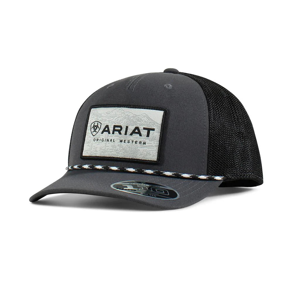 Comfortable Ariat men’s cap by M&F Western Products. Charcoal front panels and bill with Ariat logo on a rectangular patch. Braided rope detailing across the bill. Black mesh back panels with snapback closure for a perfect fit