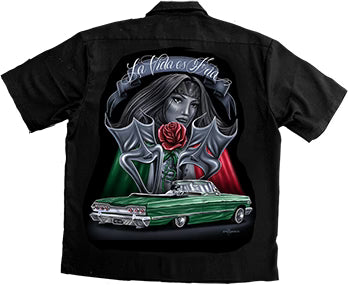 DGA Men's Work Shirt. High Quality Shirt With an Embroidered Patch on the front of the shirt and High Quality Print on the back. The Pocket Patch on the front, also has the shirt Art printed on it. Its 85% Polyester 15% Cotton.