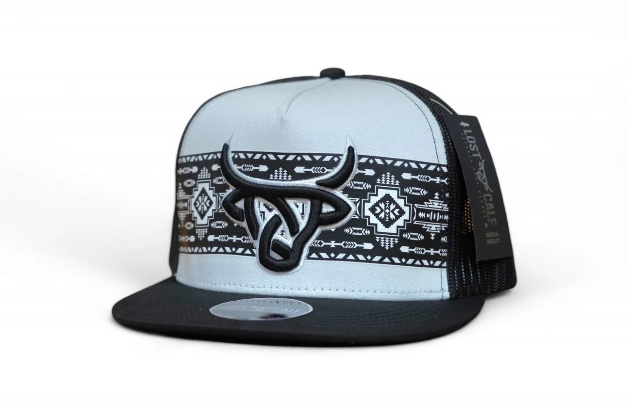 Baseball cap with aztec design and embroidered logo on front , Lost Calf logo on left side. Snap back - one size fits all.