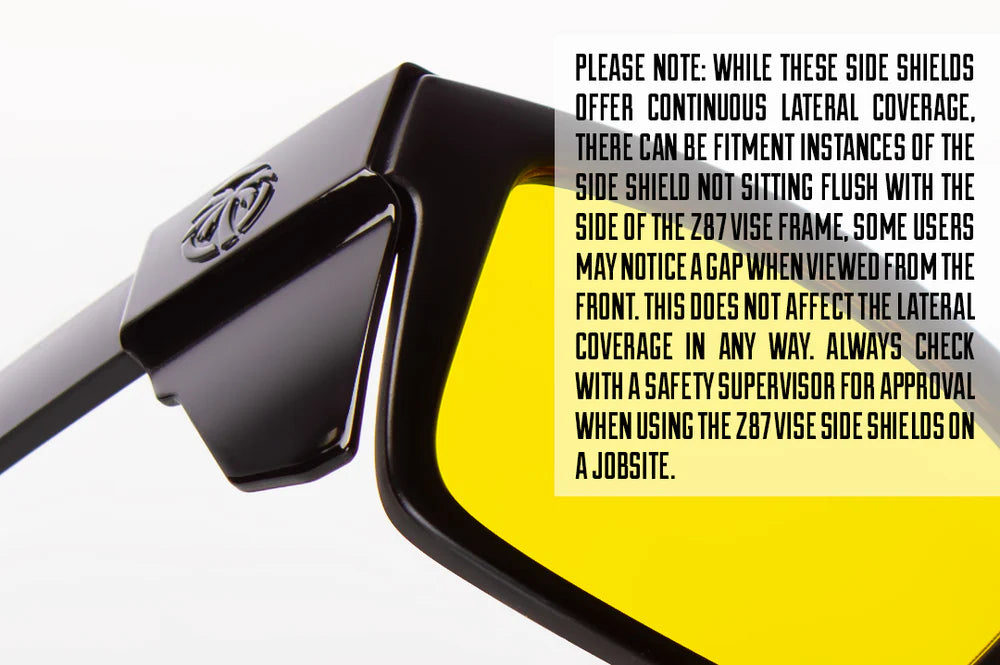*PLEASE NOTE: While these side shields offer continuous LATERAL coverage, there can be fitment instances of the Side Shield not sitting flush with the side of the z87 Vise frame, some users may notice a gap when viewed from the front. This does not affect the lateral coverage in any way. Always check with a safety supervisor for approval when using the z87 Vise Side Shields on a jobsite.*